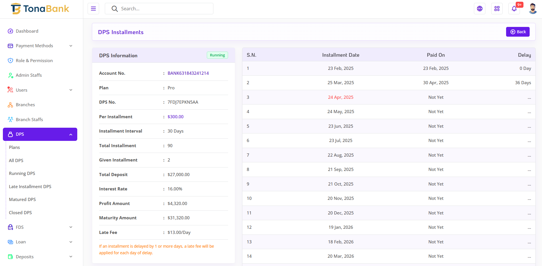 The DPS Management feature in TonaBank provides a comprehensive toolset for creating, configuring, and managing customer savings plans. By allowing flexible setup of DPS terms, automated handling of delayed payments, and detailed tracking of account status, the system helps the admin maintain full control over the bank’s savings operations. This ensures customers have access to well-managed savings options, while the bank benefits from streamlined oversight and improved financial planning.