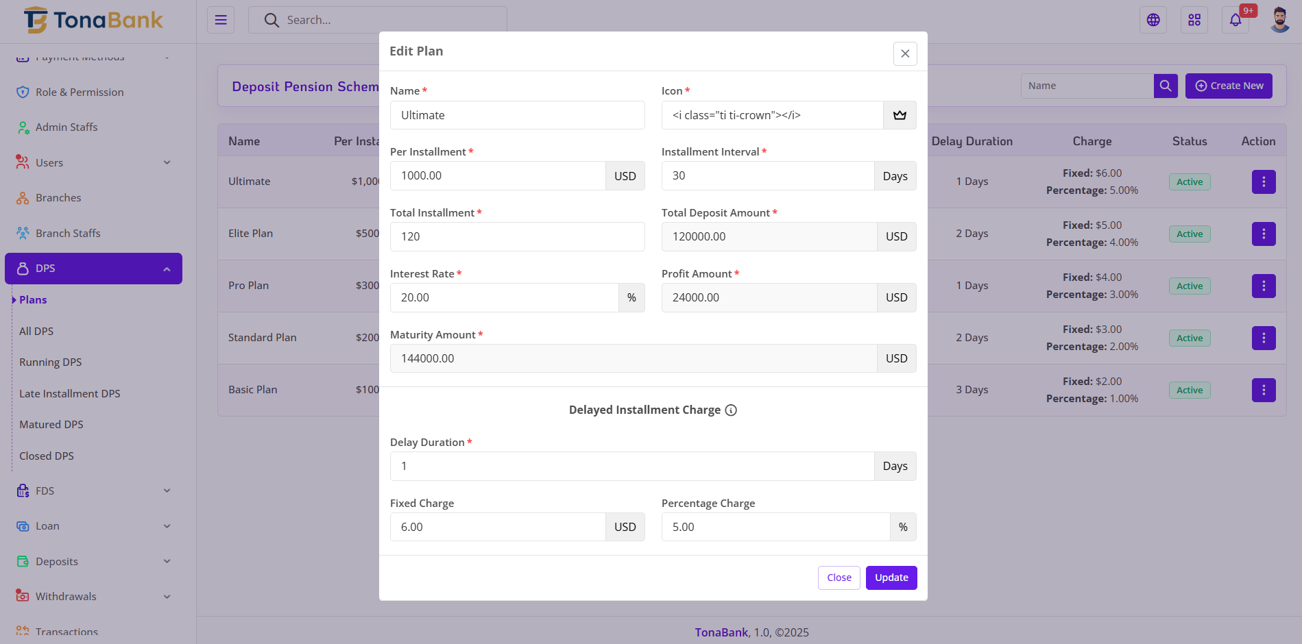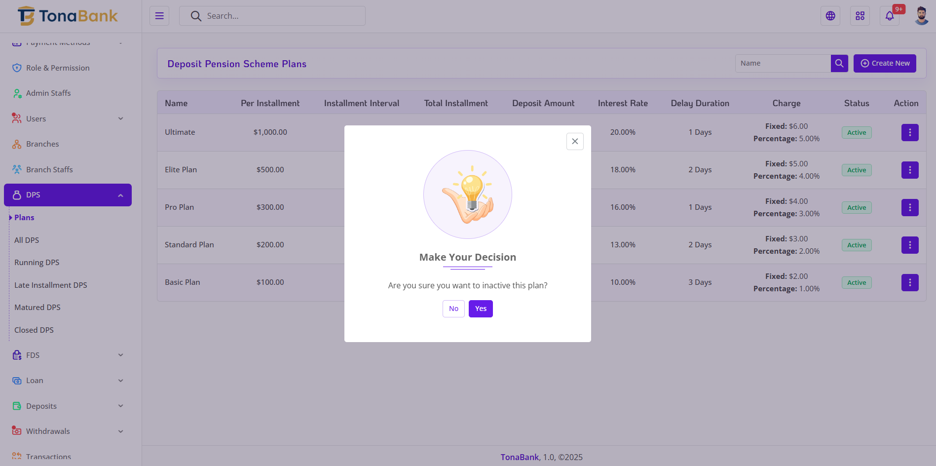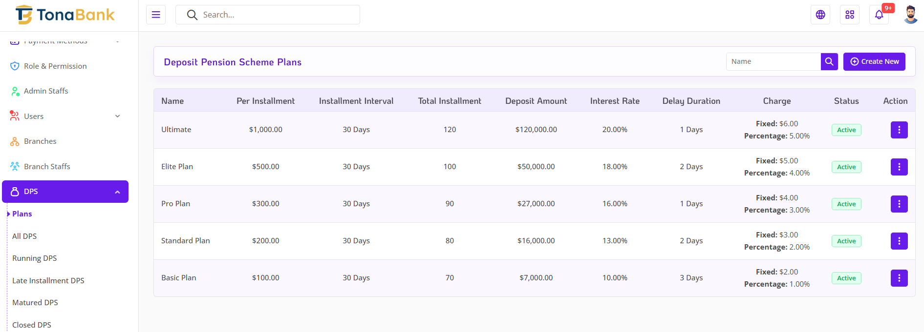 The DPS (Deposit Pension Scheme) Management system in TonaBank enables the admin to create and oversee various savings plans for customers. This module gives the admin full flexibility to design DPS plans with customized terms, monitor their progress, and manage all aspects of the deposit lifecycle. With robust controls for charges, status tracking, and plan management, the DPS system helps ensure smooth handling of customer savings schemes while maximizing efficiency for the bank.